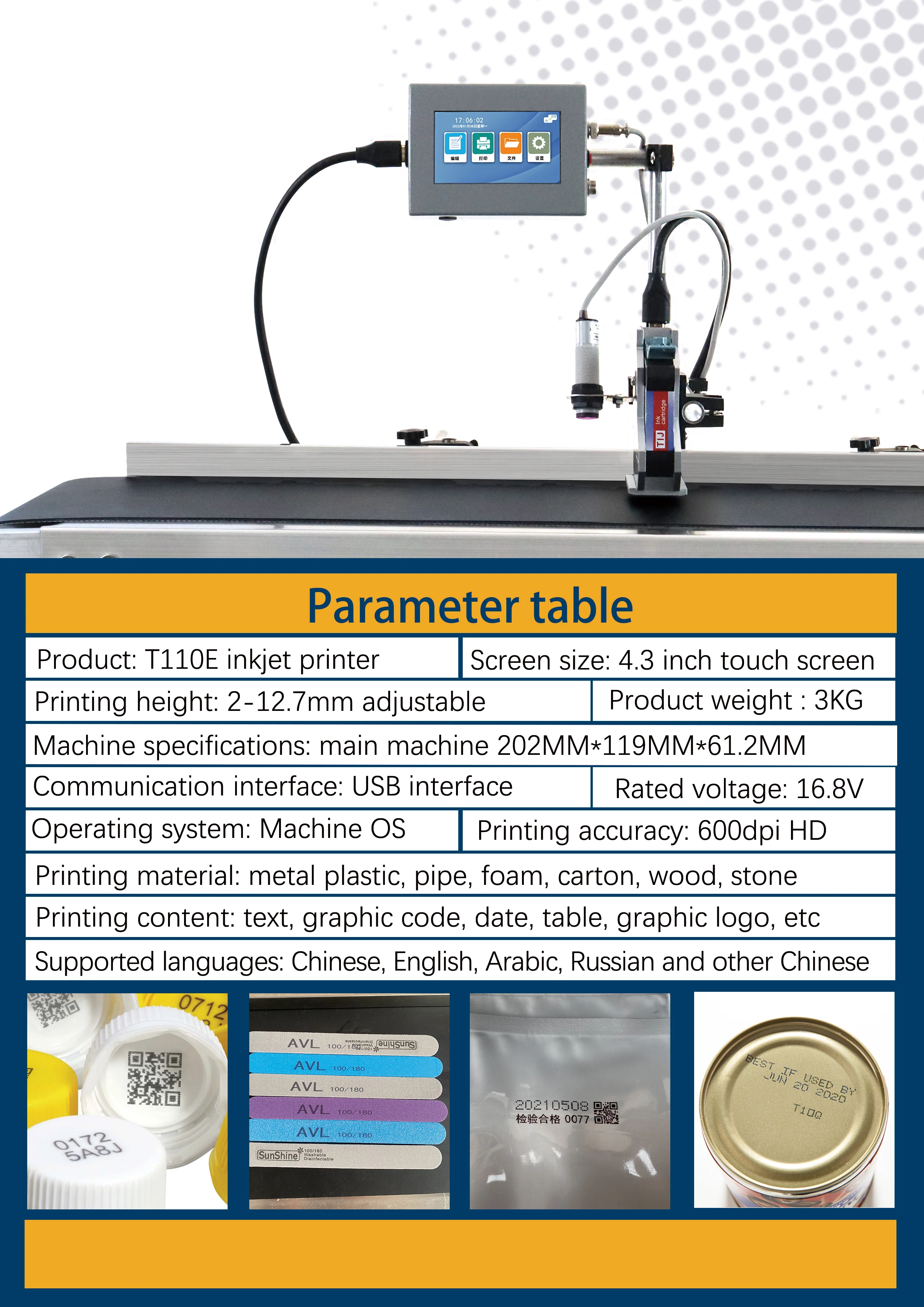 Item Name: T110E inkjet printer | Product color: single color | Connection: pannel control | Screen Size: 4.3 inch touch screen | ||