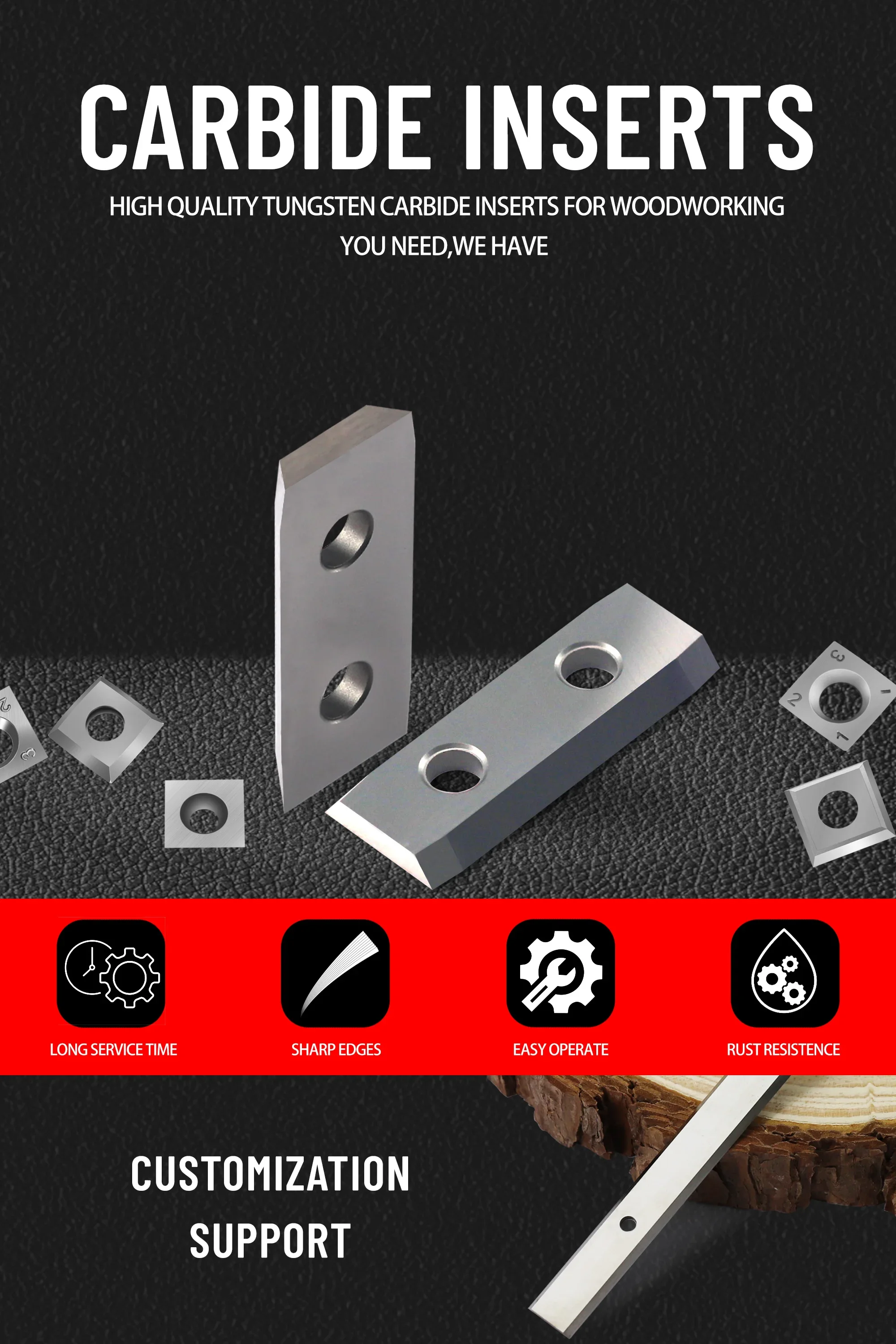 2.Made of High-grade Tungsten Carbide Material Ensures Both Quality Results and Long Usage Time. All Carbide Inserts for Wood Are All Precision Manufactured to Industrial Grade. Excellent Resistance to Corrosion, Oxidtion and Mechanical Wear.
