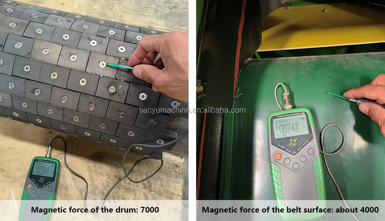 型号 Model | 皮带总宽 Belt Width | 总功率 Power (kw) | 转速 Rotation speed(r/m) | 磁场强度 Magnetic Force (Gauss) | 产能 Capacity (m³/h) | 外形尺寸 Dimension (m) | 重量 Weight (t) |