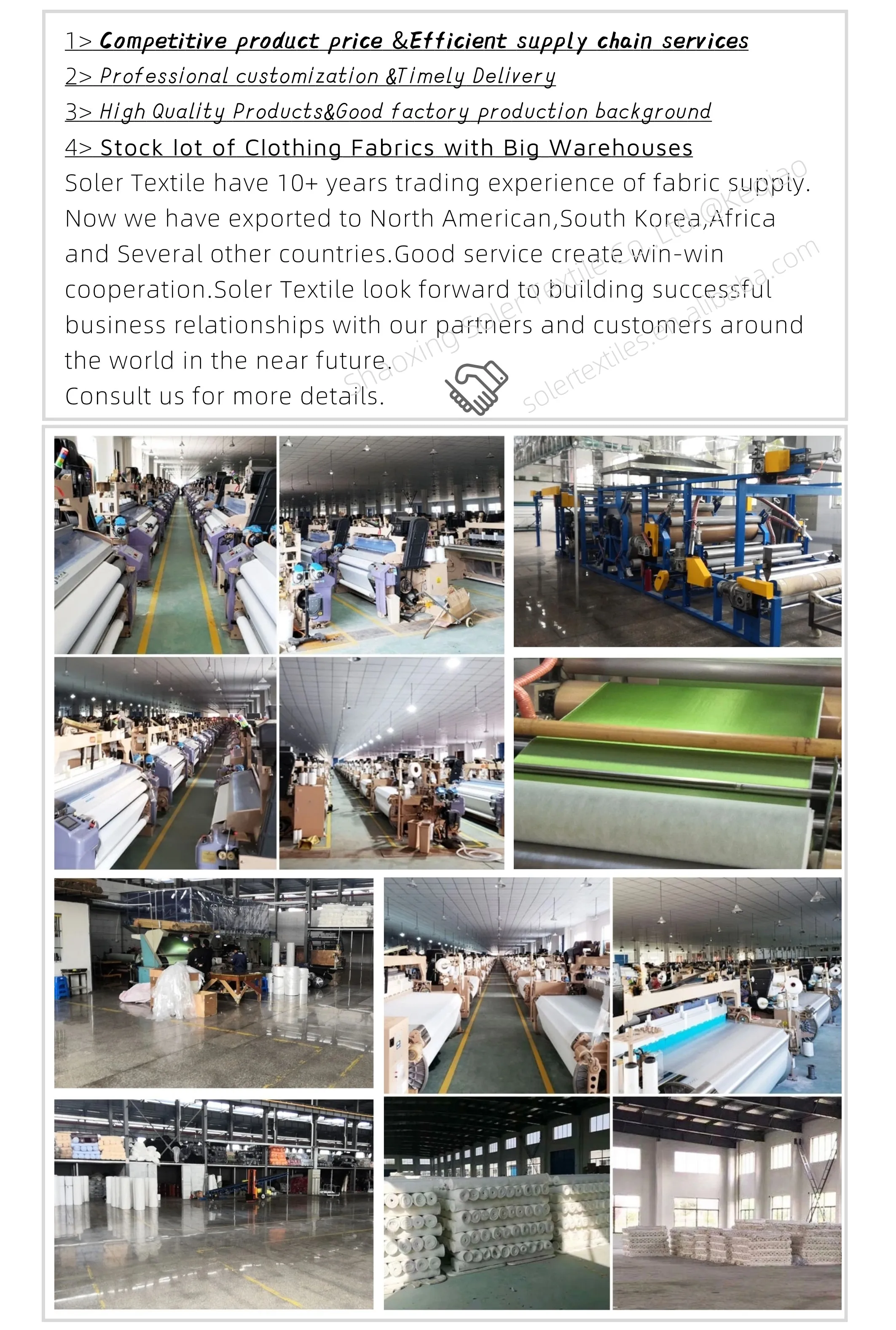 1:Q: CAN I GET FABRIC SAMPLES? A:Please give us more details of the fabric, for example, the weight , the width ,composition etc.