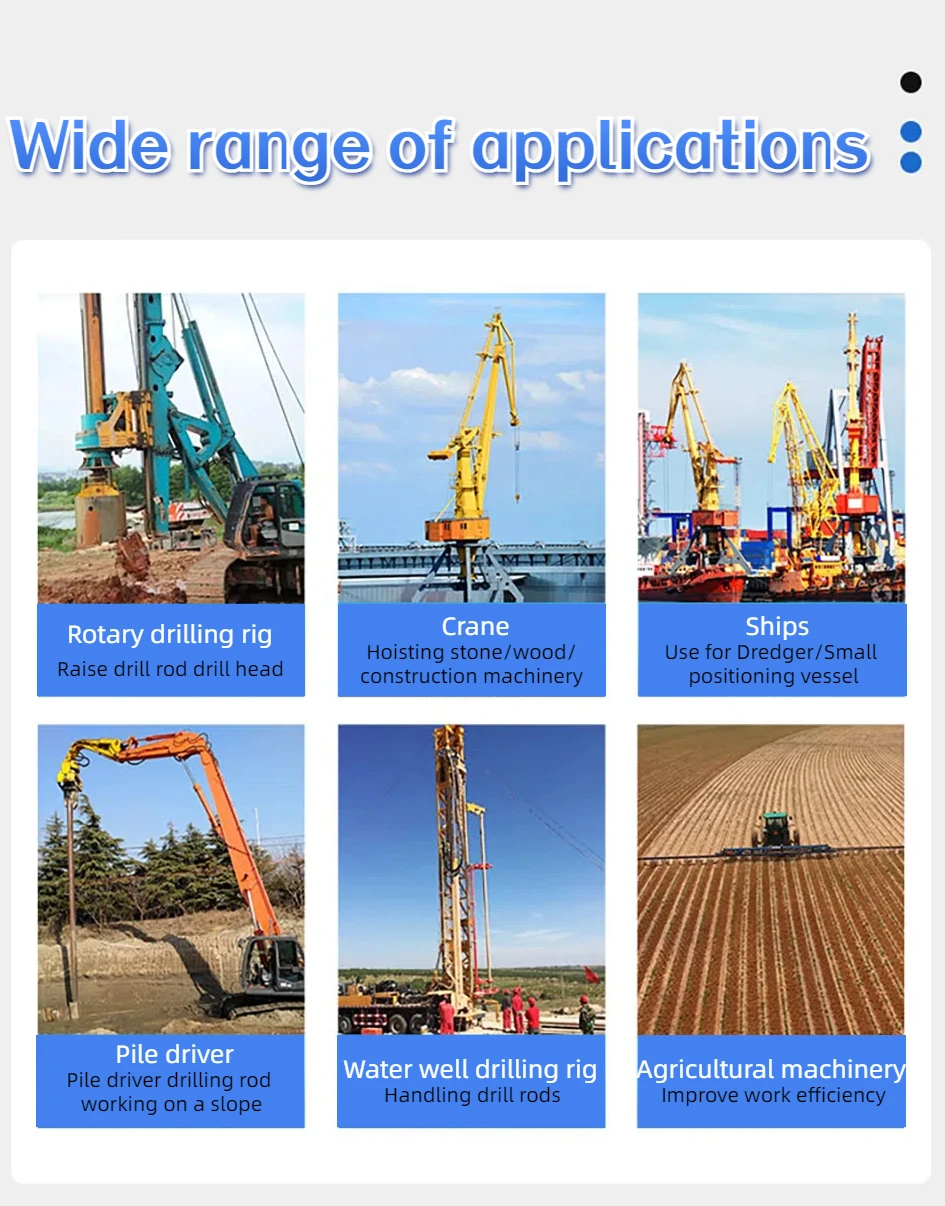 Hydraulic winches are mainly used for towing and lifting heavy objects and are widely used in fields such as ships, cranes, oilfield drilling, and port lifting. They can deliver high torque and continuous operation capabilities, suitable for handling heavy objects and scenarios that require high stability.