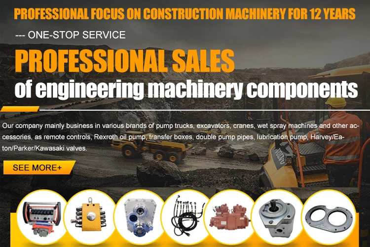 Our company mainly business in various brands of pump trucks, excavators, cranes, wet spray machines and other accessories, as remote controls, Rexroth oil pump, transfer boxes, double pump pipes, lubrication pump, Harvey/Eaton/Parker/Kawasaki valves. |
