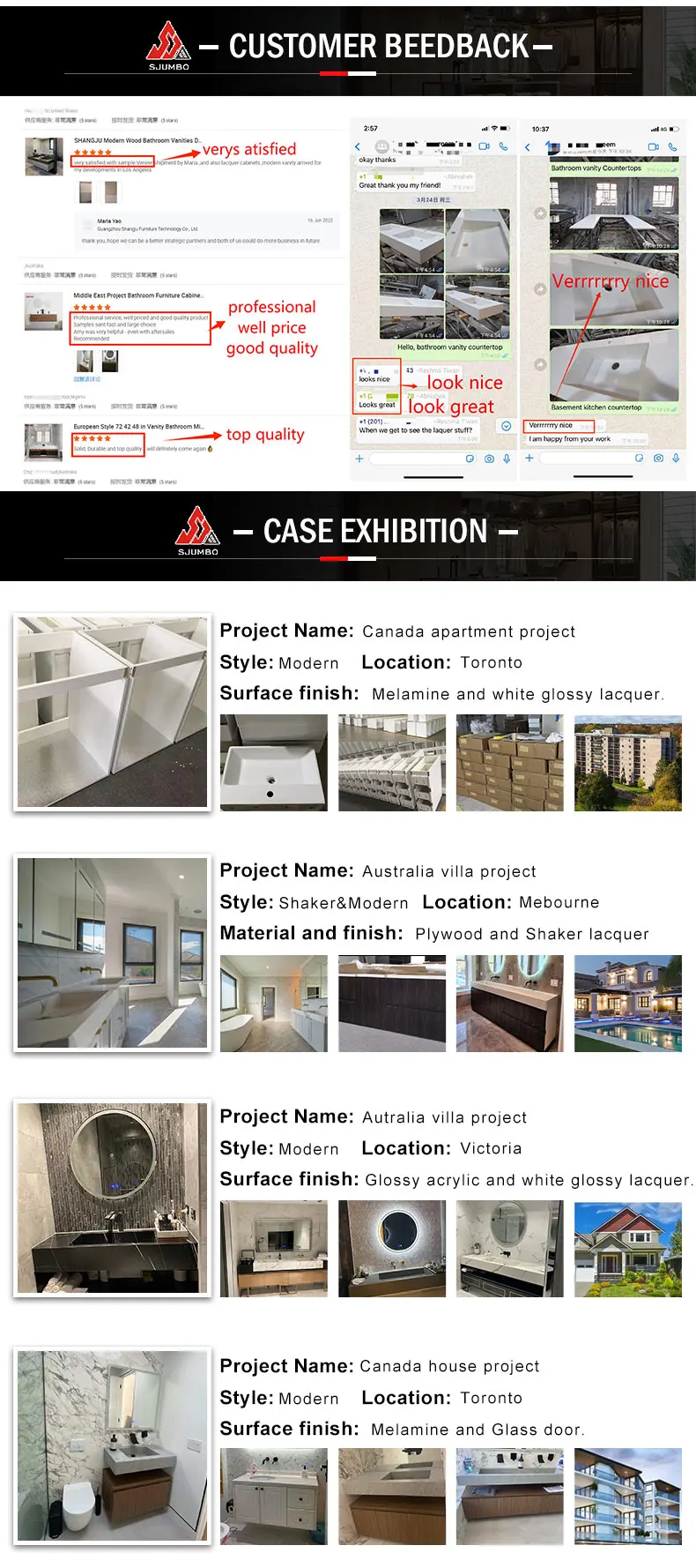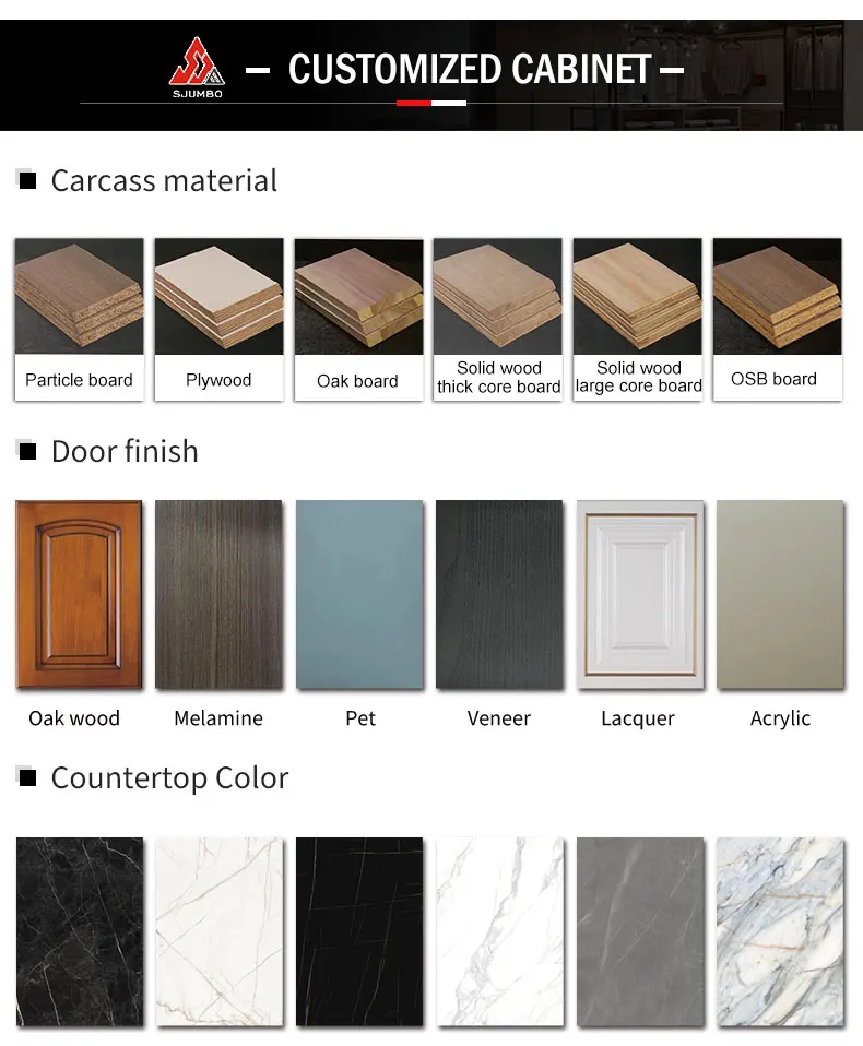 Q1:How can I get the sample to check your quality? A:After price confirmation, you can require for samples to check our product's quality. We will provide you sample for free as long as you afford the express freight. Q2: What can I get the price? A:We usually quote within 24 hours after we get your inquiry. If you are very urgent to get the price, please tell us in your email so that we will regard you inquiry priority. Q3:What is your term of delivery? A:Depends on various products, it can be from 20 days to 35 days. Q4: What about the lead time for the mass production? A:Honestly, it depends on the order quantity and the season you place the order. Q5: Can I conduct a video inspection of the factory? A:Yes. of course, anytime welcome. Our Main Products: Wardrobe/Closet. Kitchen Cabinet. Bathroom Cabinet. Wooden door. All can be customized according to your requirement. IF YOU HAVE ANY OTHER QUESTIONS, PLEASE CLICK HERE TO "SEND AN INQUIRY"If you need matching bathroom mirror, bathroom sink and kitchen sink, please click on the link to our other store: https://gzsjumbo2.en.alibaba.com/minisiteentrance.html?spm=a2700.details.0.0.614211e18D0hRD&from=detail&productId=1600728522166