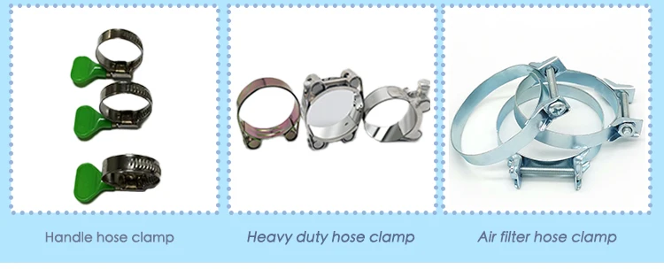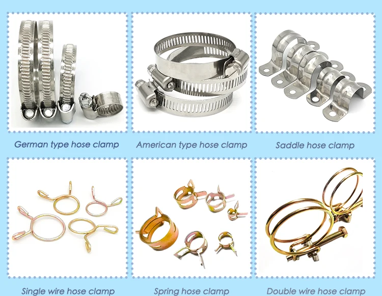 Products cover all kinds of hose clamps like American type hose clamp, German type hose clamp, Air filter hose clamp, Saddle hose clamp, Heavy duty hose clamp, Single/Double wire hose clamp, Spring hose clamp, R type hose clamp and other customized hardware tools. They are widely used in different fields such as automobile, ship, construction, drainage, fire control, household,machinery, municipal project, agriculture, chemical and so on.