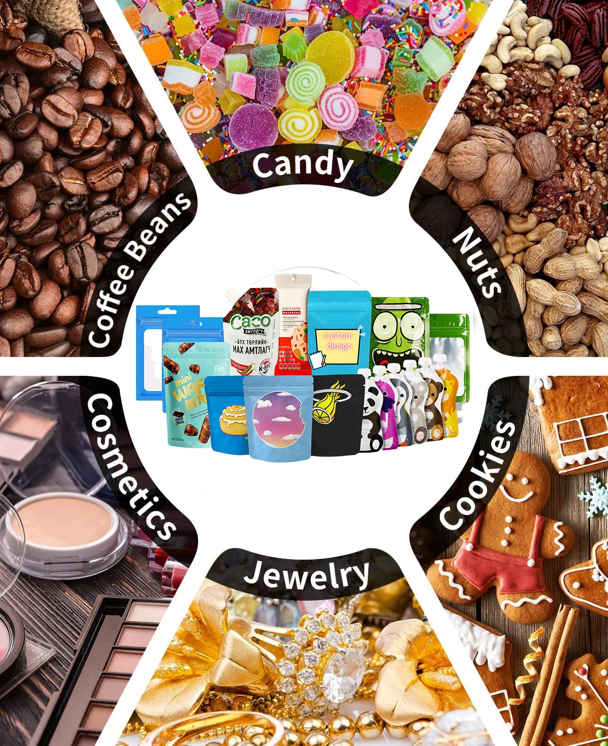 Bag Type | Stand Up Pouch, Flat Pouch, Flat Bottom Pouch, Side Gusset Pouch, Spout Pouches, Irregular Shaped Pouch, Roll Film, Sticker Labels, etc. |