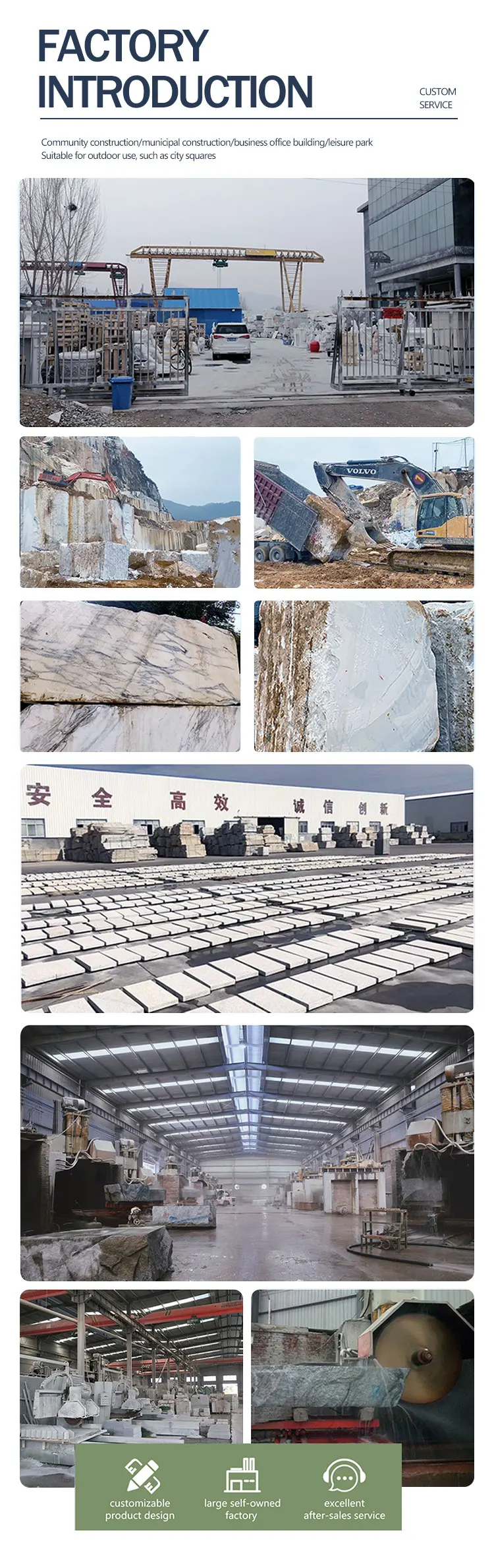 QUYANG is a factory with over 30 years of experience, specialized in producing architectural decoration material. Main products include do marble floor, exterior wall stone, marble garden landscape products,marble/bronze/stainless steel sculpture,bathroom products,self-adhesive wall cloth,thermal insulation waterproof material and various product accessories... etc., there are varies of automated production plants. All details are strictly checked for providing products according to customers' requirements.QUYANG offers you superior quality, variety and service. Our projects are applicable for outdoor,garden,houses,villas,apartments, hotels, plazas, railway stations and so on.