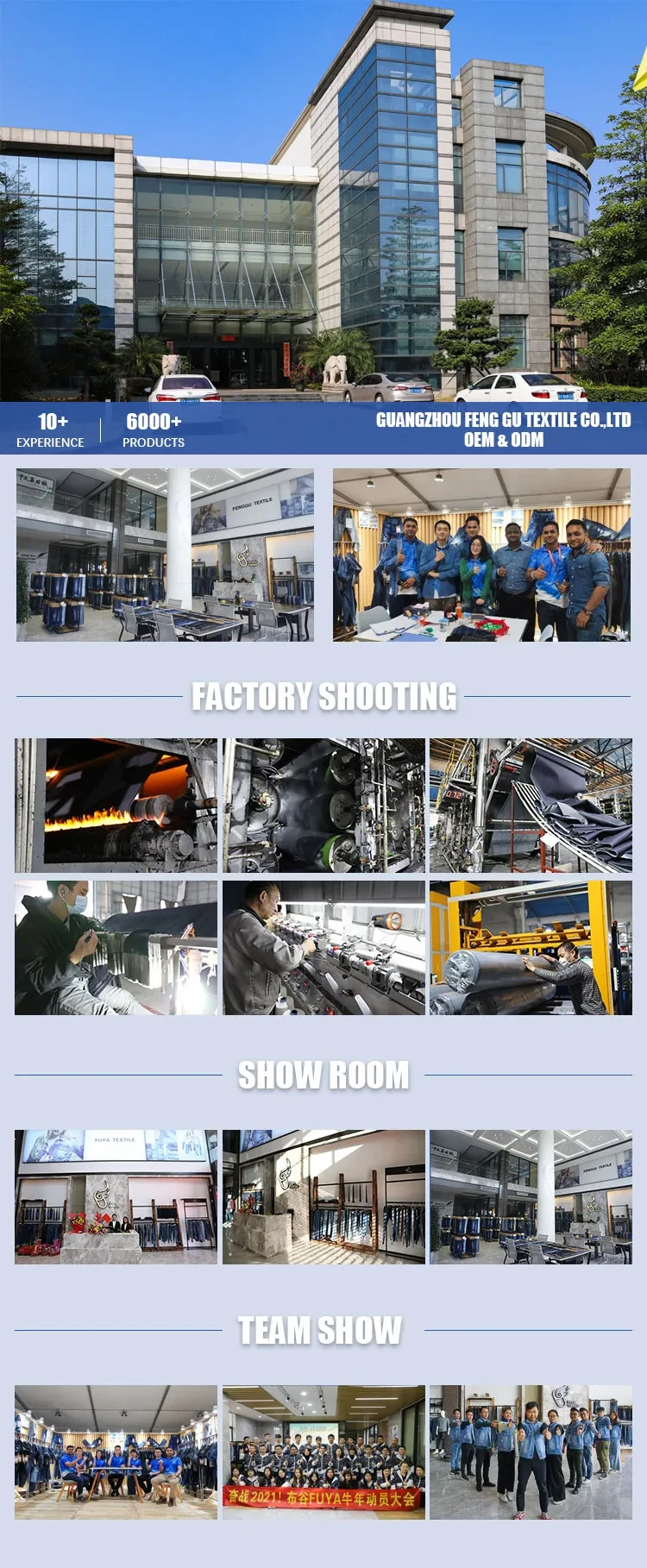 Founded in 2006, Guangzhou Fenggu Textile Co.,ltd (Fuya Denim Textile Brand) is a professional denim fabric manufacturer integrating R&D, production and marketing under one roof, with its research and production center headquartered in Huadu District Guangzhou. With specialty and over a decade's of experience in denim production and operation, the company is equipped with advanced technology and machine ; we have 8 warp sizing production lines , 2 rope dyeing and pulp dyeing lines, 500 PICANOL OptiMax rapier high speed machine, and 3 finishing production lines . Our annual output reaches to 50 million yard. Our products are sold and well-known both home and abroad.