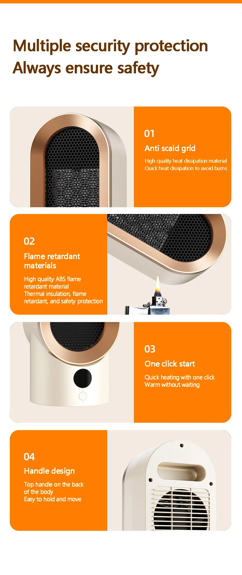 Adjustable Thermostat, Overheat Protection, Tip-Over Protection, Ventilation