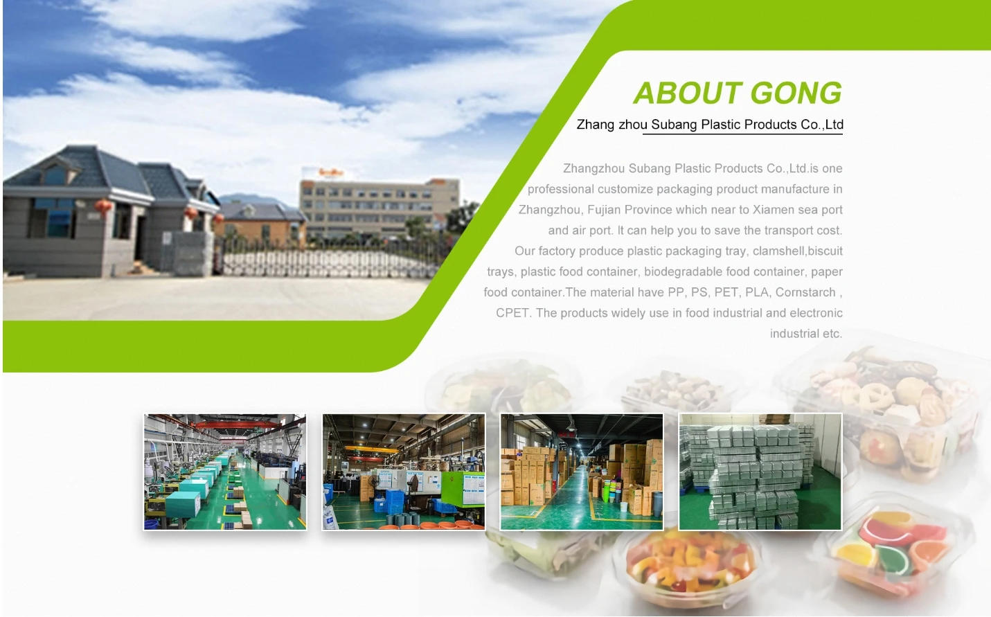 factories,respectively in produce plastic food containers and paper food packaging products, mainly cooperate with the food factories and catering food packaging at home and abroad. The factory has more than 20 machines, make sure of fast delivery and price competitiveness.