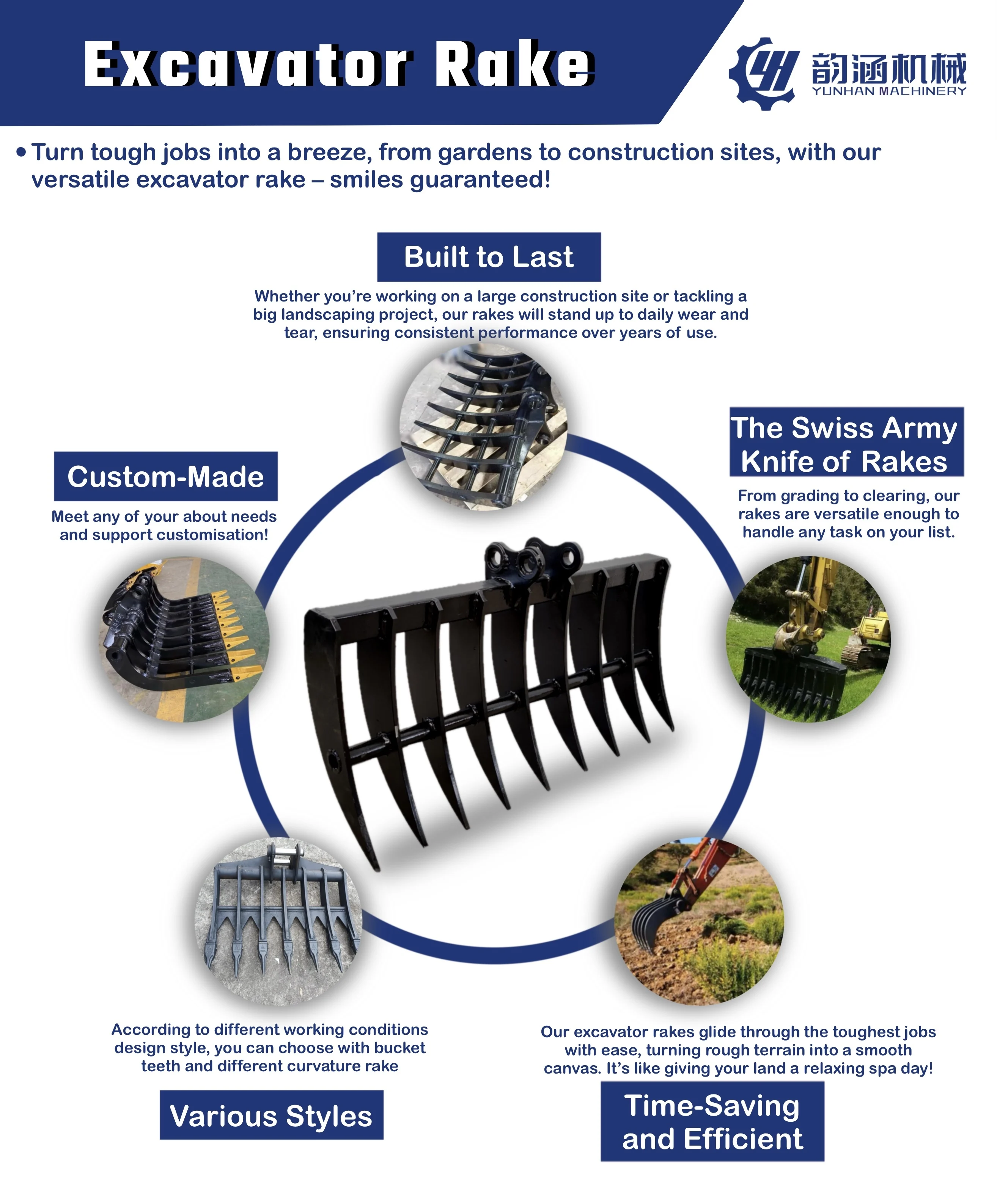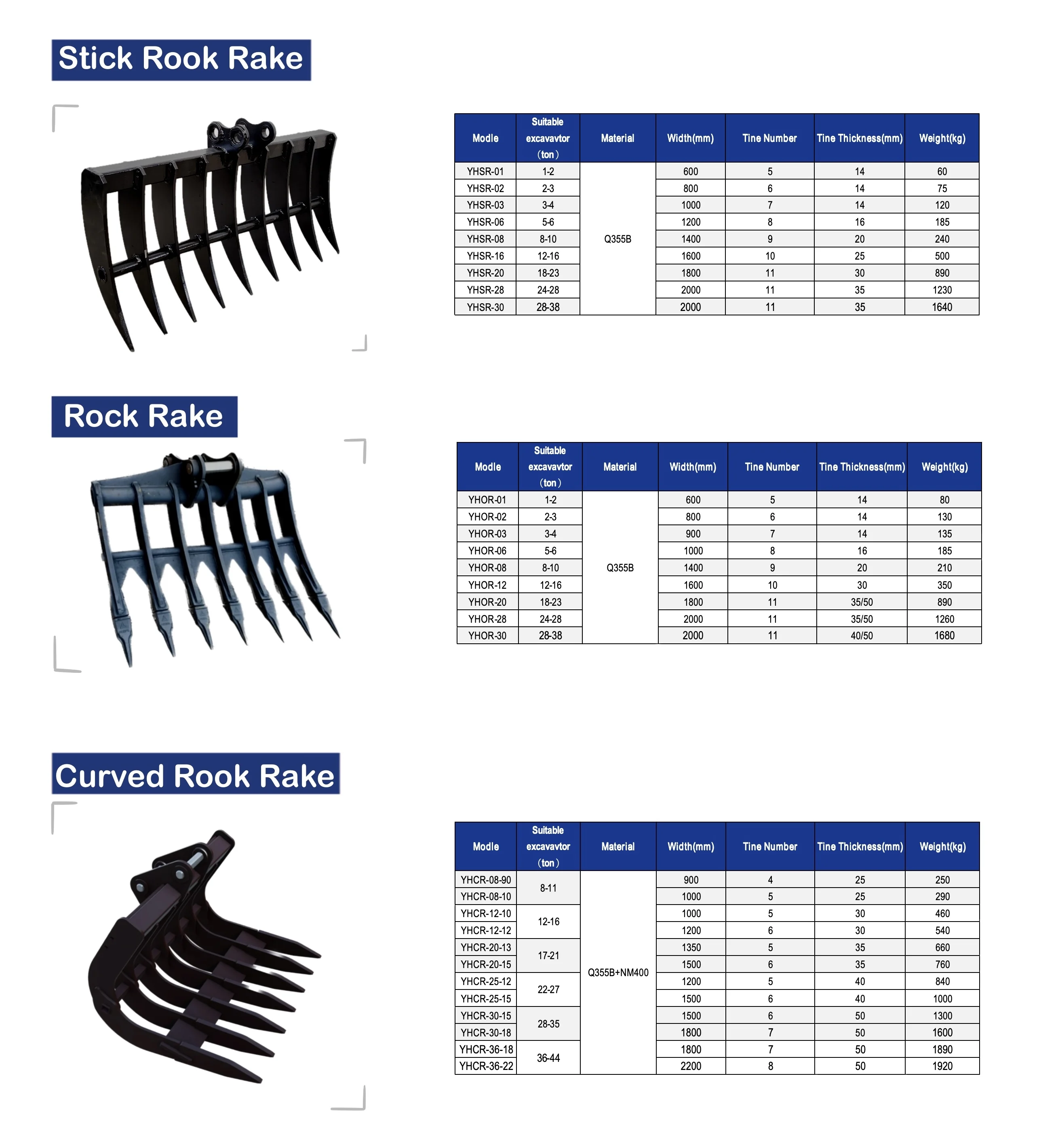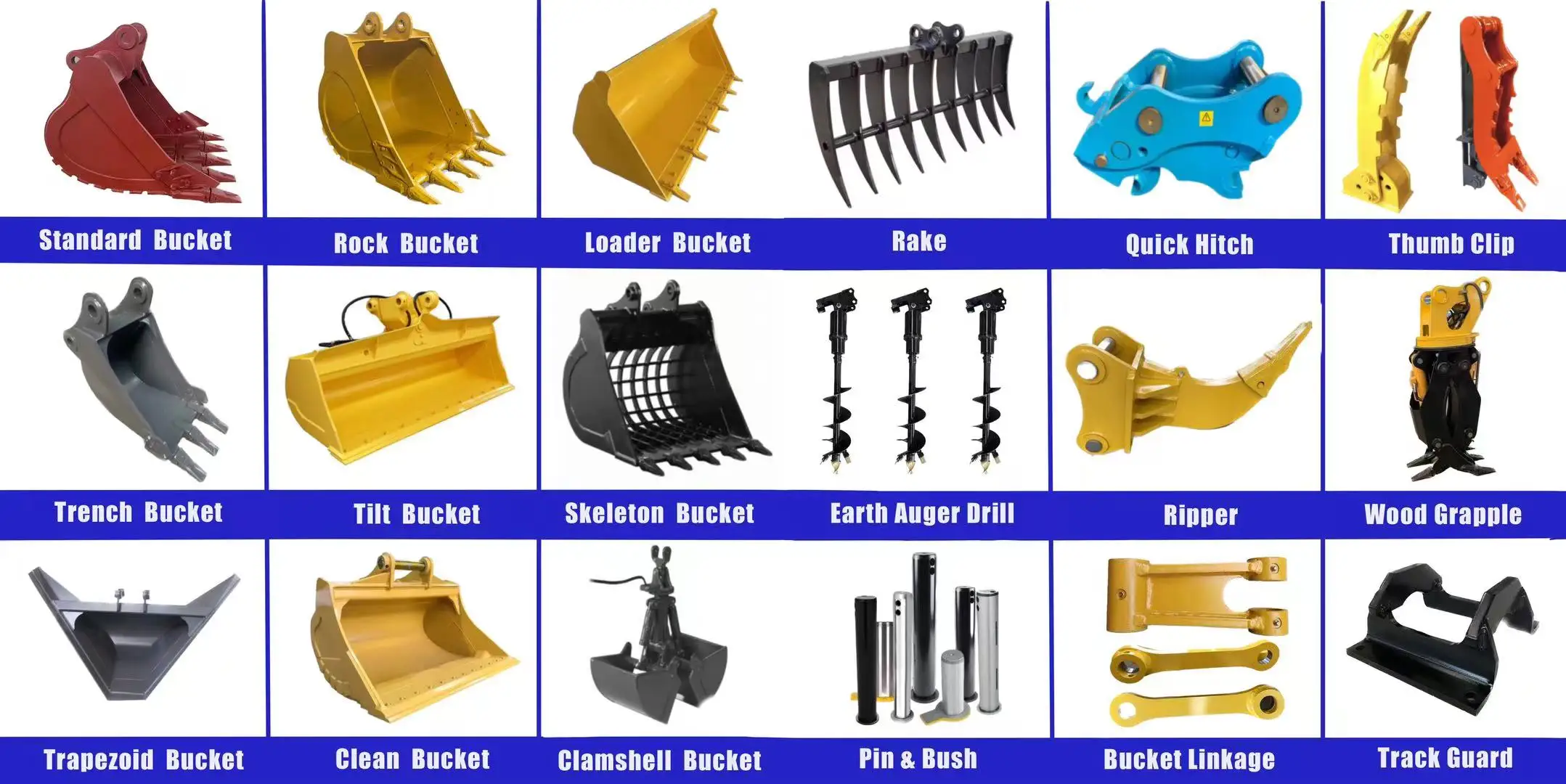 excavator buckets, rippers, quick hitches, grapples, thumbs, rakes, booms & arms, for different brands of earthmoving machinery,such as CAT, Komatsu, SHANTUI, ZOOMLION, Wackerneuson,etc.