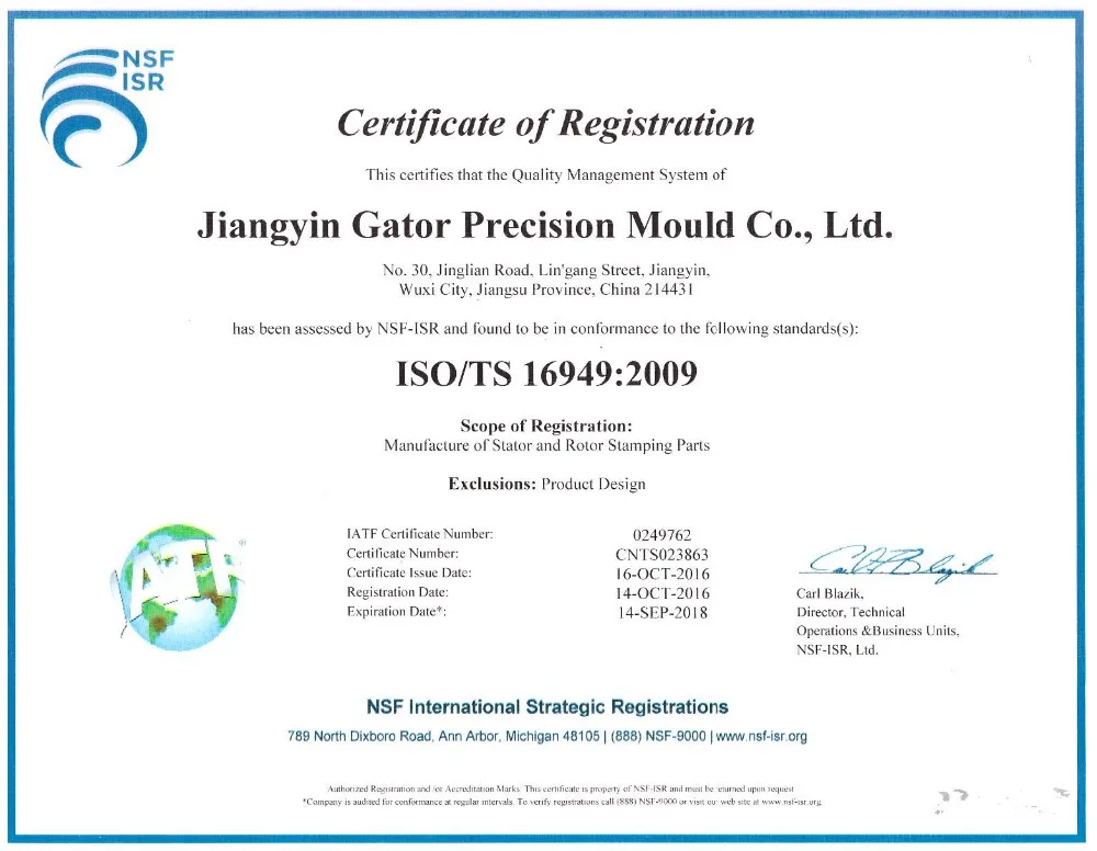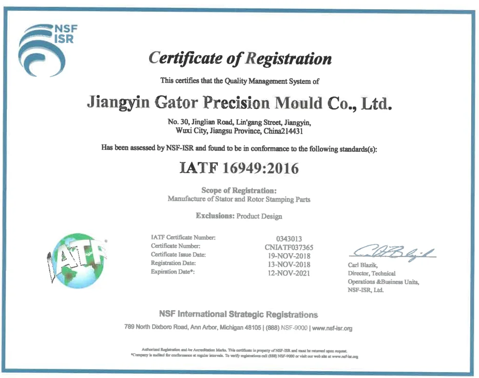 JIANGYIN GATOR WAS FOUNDED IN 2011, WHICH LOCATES IN JIANGYIN CITY, JIANGSU PROVINCE. OUR FACTORY AREA AROUND 20,000㎡, INCLUDE MOLD WORKSHOP, STAMPING WORKSHOP, STACKING AND ASSEMBLING WORKSHOPS. WE SPECIALIZES IN CUSTOMIZING VARIOUS KINDS OF MOLDS,STATORS AND ROTORS FOR THE MOTORS , AND HAVE NEARLY 15 YEARS EXPERIENCE IN THIS INDUSTRY AREA. UNTIL NOW, GATOR DEVELOPED MORE THAN 30 PATENTED UTILITY MODEL TECHNOLOGY. MEANWHILE GET THE IATF16949 CERTIFICATE IN 2016.