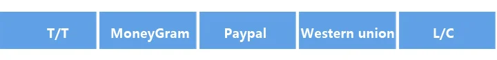 A: после того, как вы подтвердите наш PI, необходимо будет заплатить. Почтовый/Банковский перевод (банк HSBC), Paypal и Western Union-системы, которые мы обычно используем.