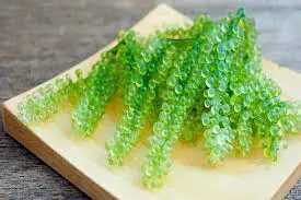 These little green plants are part of the algae family and typically grow in tropical and subtropical climates with strong sunlight. They’re called ‘latô’ in the Philippines,’latok’ in Malaysia, “umi-budō” in Japan, “green vegetarian caviar” or “sea grape caviar’ in America.