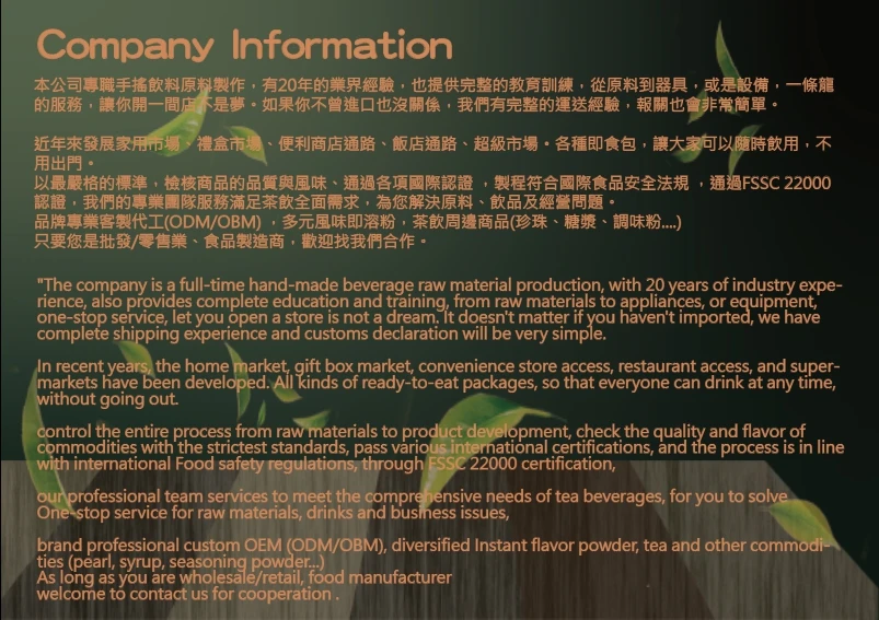 "The company is a full-time hand-made beverage raw material production, with 20 years of industry experience, also provides complete education and training, from raw materials to appliances, or equipment, one-stop service, let you open a store is not a dream. It doesn't matter if you haven't imported, we have complete shipping experience and customs declaration will be very simple.