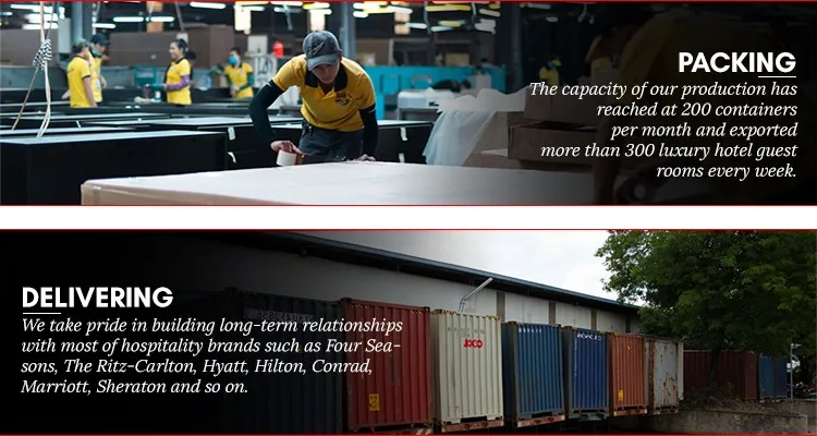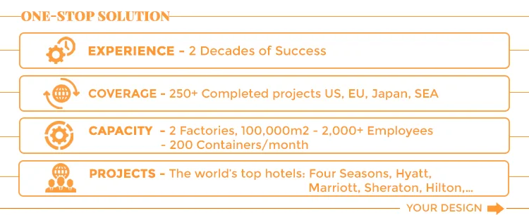 Наши гостиничные мебельные фабрики работают над массовым производством под строгим контролем качества. Цель состоит в том, чтобы выполнить роскошный стандарт в каждом товаре. Это превысит ваши ожидания и требования к проекту. В результате мы получаем удовлетворенность клиентов.