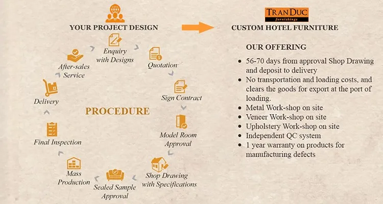Он имеет решающее значение. На основе живого образца, который будет согласован обеими сторонами, прежде чем двигаться вперед к массовому производству. Мы также являемся крупным производителем гостиничной мебели. Есть много секций в нашем массовом производстве. Несколько членов команды контроля качества будут нести ответственность за каждый раздел. Они проверят и сообщат, чтобы обеспечить качество нашего производства.