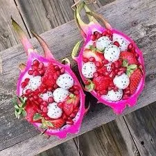 There are three types of dragon fruits, namely, red skin with red flesh, red skin with white flesh, and yellow skin with white flesh. There are both sweet and sour dragon fruits, depending on the species, shape, and size. In terms of the most common form of dragon fruit, it is slightly smaller than a cantaloupe, red in color, and covered in broad spiky growths.