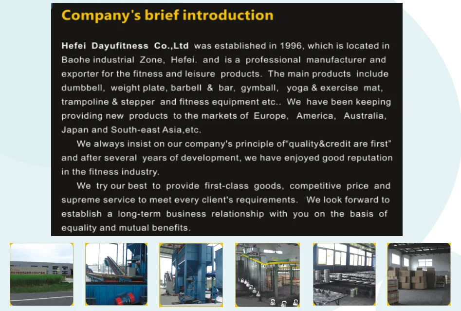DAYU FITNESS CO.,LTD established in 1996, which is a professional manufacturer of all kinds of sporting goods and fitness equipment. We are famous for our good credit and quality in the country, we make a big market not only in China but also most countries all over the world.