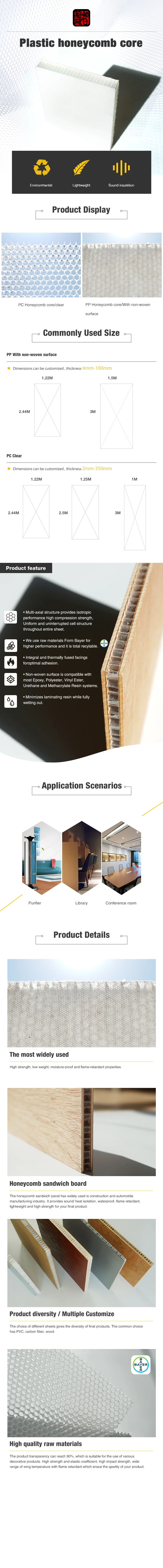 Light weight,high compressive strength,anti-water,anti-humidity honeycomb can be used as structure in floor,ceiling,wall.Besides,pp honeycomb can cut down body weight,increase speed,save energy when honeycomb structure make guarantee for body strength.Hereby our pp honeycomb widely used in boat,yatch,port bridge,truck body,building,FRP and so on