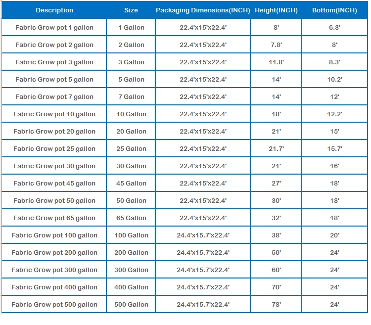 Grow Pot Specifications(Customize Sizes Available):
