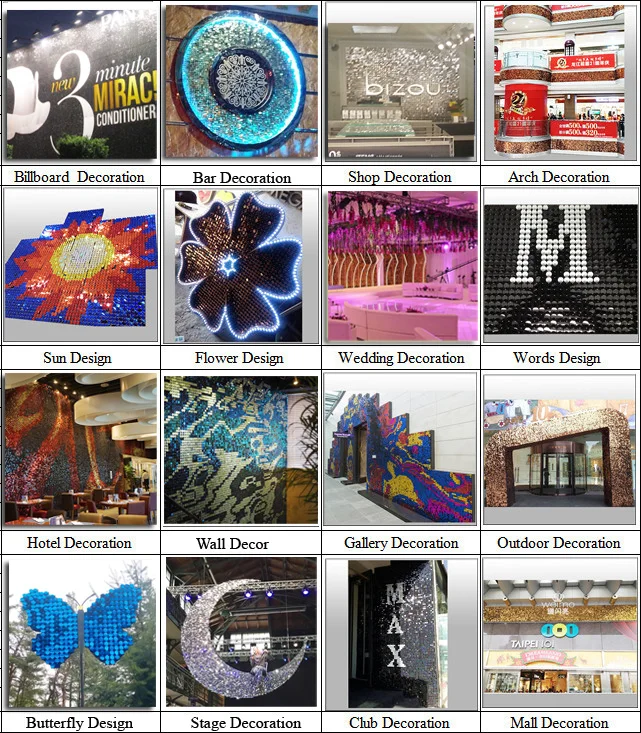 Мы использовали вокруг 2300 шт. блесток панелей на столовая стены Sheraton, гостиница, общая площадь стены более 200 квадратных метров. Различные красочные панели сочетаются вместе, чтобы сделать стены блестящей и блестящим эффектом, выглядит как стена огня.