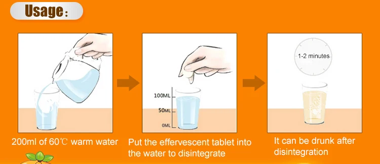 Usage and dosage | 1 tablet one time, 3 tablets one day. Put one tablet into about 200ml warm (cool) drinking water and drink after it dissolves. Drink it after meals. |