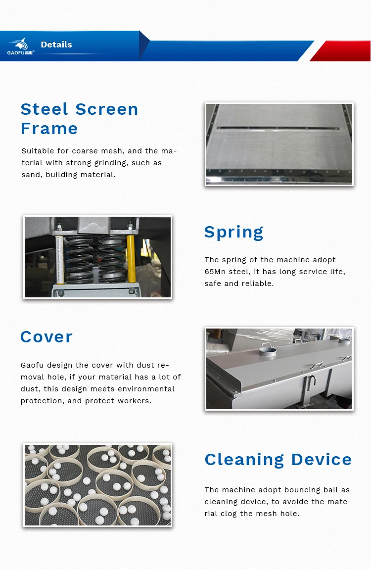Вибрационный сито машина использует двигатель в качестве источника вибрации, делая материалы быть брошены и двигаться вперед в прямой линии на экране. В нижней части рамки экрана есть несколько шариков, которые ударяются друг о друга при вибрациях, что позволяет очистить экран и эффективно избежать блокировки.