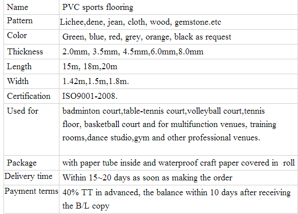 Среди них, основные продукты компании, серия pvc sports floor широко признаны пользователями дома и за рубежом и принимаются конкурентами. Который обслуживает отечественный и зарубежный рынок данных наземного украшения по разумной цене и отличного качества. Спортивный пол в основном используется для бадминтона, настольного тенниса, волейбола, баскетбола, тенниса, различных соревнований и спортивных площадок, общественных спортивных залов и всех видов фитнес-клубов, коммерческий этаж в основном используется в торговых центрах, супермаркетах, офисных зданиях, больницах, школах, детских садах и т. д. Пользуется спросом у большинства клиентов.