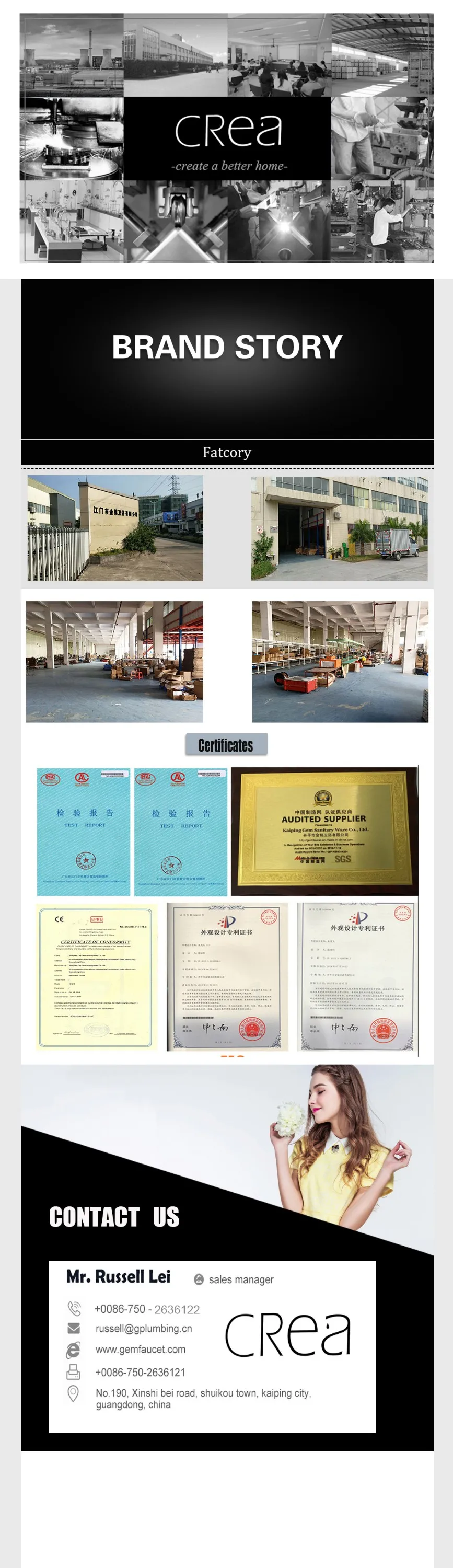 Kaiping City Gem Sanitary Ware co., Ltd. является известным и профессиональным заводом для смесителя, душа, крана и сантехники. Мы основали в 2009 году, компания расположена в городе Кай пинг Гуандун Китай. С более чем 1000 кв. м заводской базы и dozons промышленных работников.