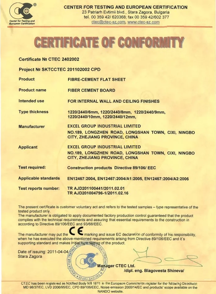 Сертификат нашей волоконно-цементной плиты