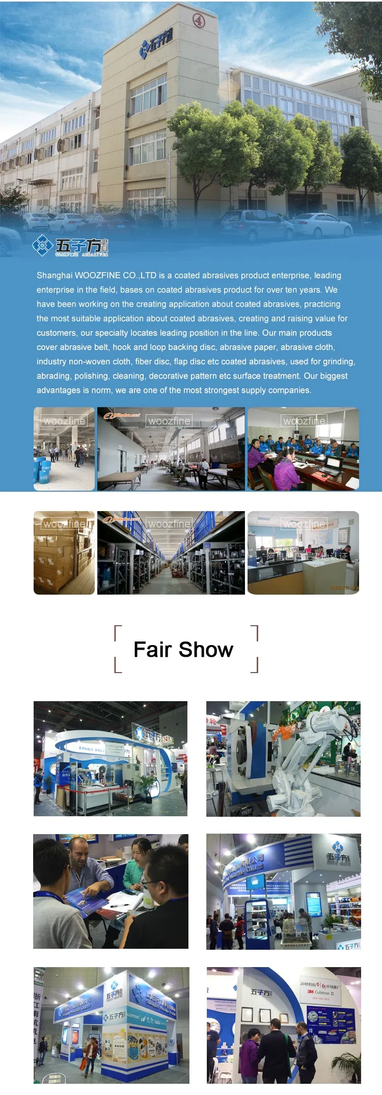 Shanghai WOOZFINE CO.,LTD passed ISO9001 Certificate and practices it strictly, It is the member of alibaba assessment enterprises for ten years, passed assessment certificate of German Rheinland and France BV. we have got license for exporting&importing business, our products are exported to Europe, America, Asia, Africa, Australia, five continents, over forty countries. WOOZFINE is the enterprise who publishes YISHA YIMO product directory. It is member of standard committee and expert committee of China coated abrasives committee.