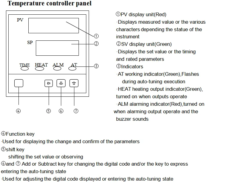 Система контроля температуры состоит из датчика (Pt100 Платиновое сопротивление), регулятора температуры и нагревателя. При получении выходного сигнала сопротивления (100Ω для 0 ℃, 0 ℃) от датчика, контроллер температуры будет отображать на PV экране реальную температуру, протестированную изнутри рабочей комнаты. Когда входной сигнал меньше заданного значения, трубка питания (двунаправленный кремниевый контролируемый выпрямитель) открывается, и нагреватель получает достаточно электрической энергии для создания тепла. В противном случае в силовой трубке Нет питания и нагреватель не нагревается.
