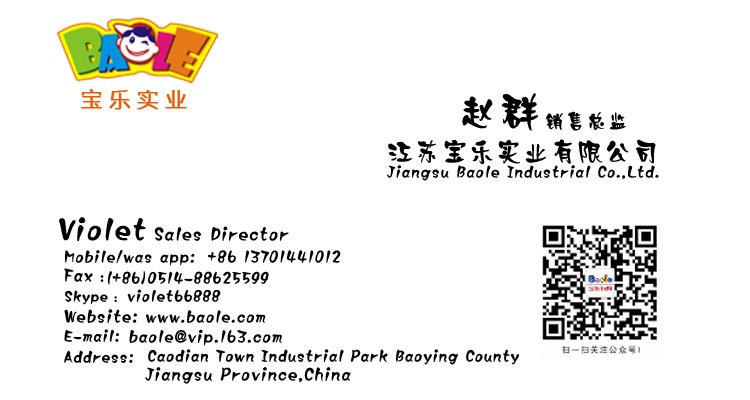 Jiangsu Baole Industial Co., Ltd. was founded in 1983, it is a professional corporation integrating research,development,manufacturing and sales of all kinds of children's toys,plastic furniture,children's indoor and outdoor large playground,desktop toys,suspended mat,outdoor fitness path,school desks and chairs,beds,rubber runway items and so on as a whole.It is the leading company in Jiangsu Province and one of the largest toy companies in China.