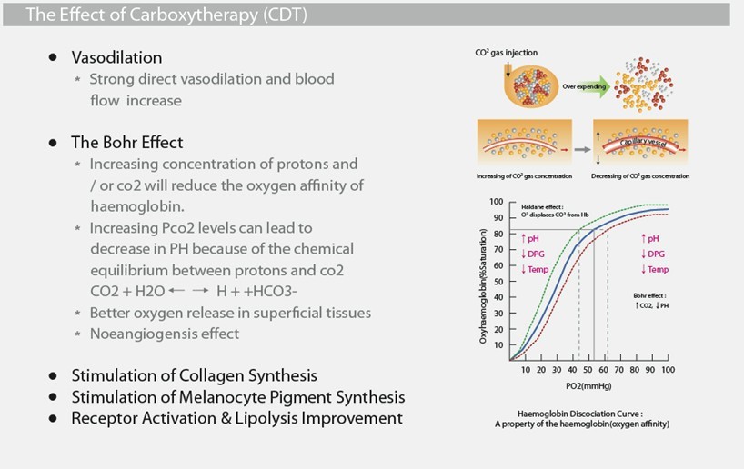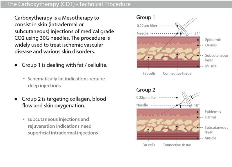 Therapy involves injecting tiny amounts of Carbon dioxide (CO2) beneath the skin to break down fatty deposits and stimulate collagen production. The treatment has no downtime and a single session can take between fifteen minutes and an hour.