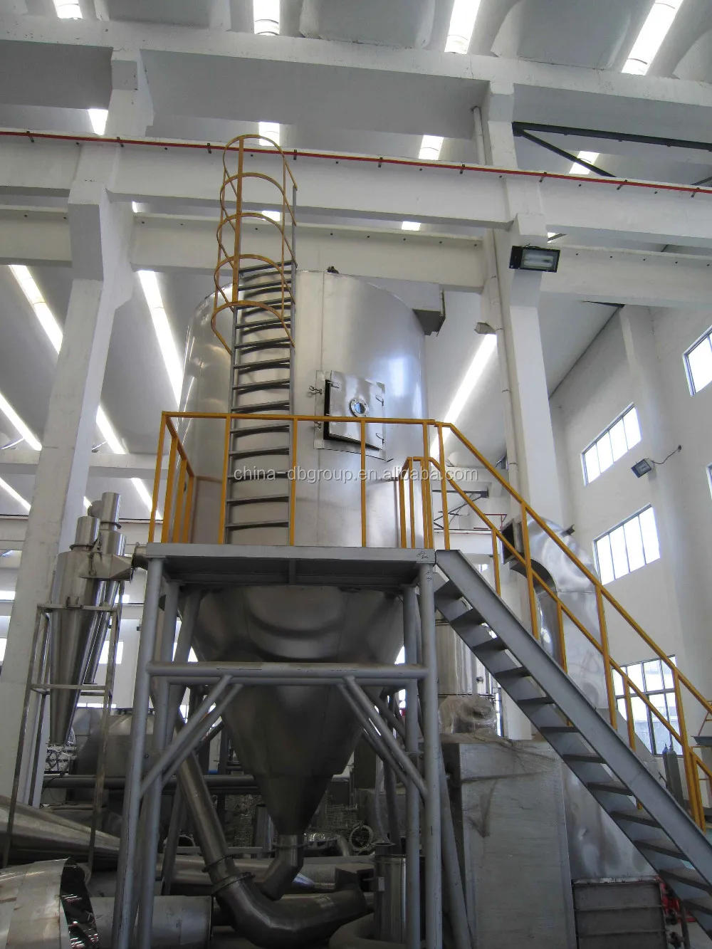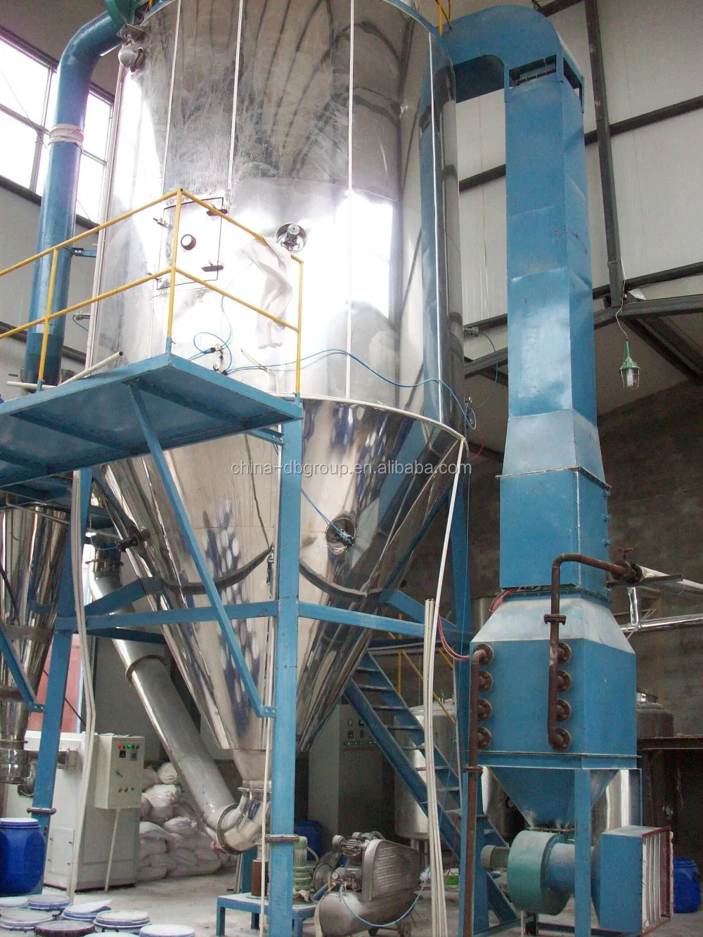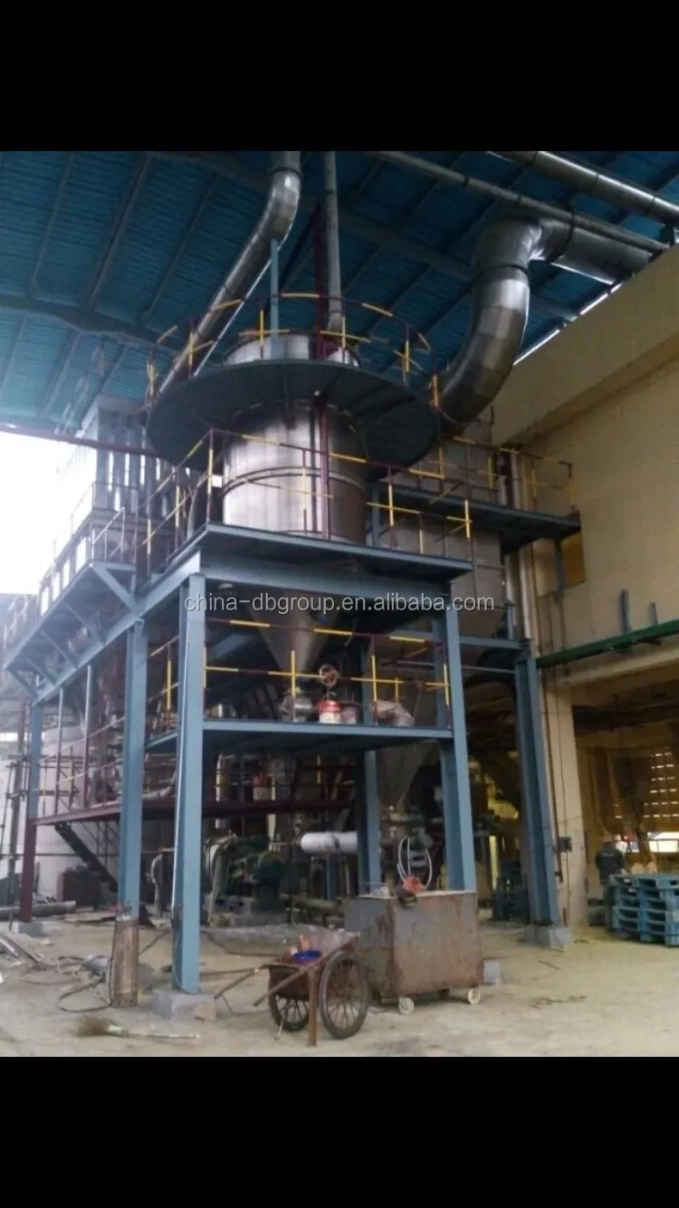 После фильтрованный и нагретый воздух поступает в воздух distrbutor на верхней части сушилки. Горячий воздух поступает в помещение для сушки в спиральной форме и равномерно. Проходя через высокоскоростной центробежный распылитель на верхней части башни, жидкость из материала будет вращаться и распыляться в чрезвычайно тонкие жидкие шарики тумана. Очень короткое время контакта с тепловым воздухом, материалы могут быть высушены в конечных продуктах. Конечные продукты будут разряжаться непрерывно с нижней части сушильной башни и от циклонов. Отработанный газ будет выгружен из воздуходувки.