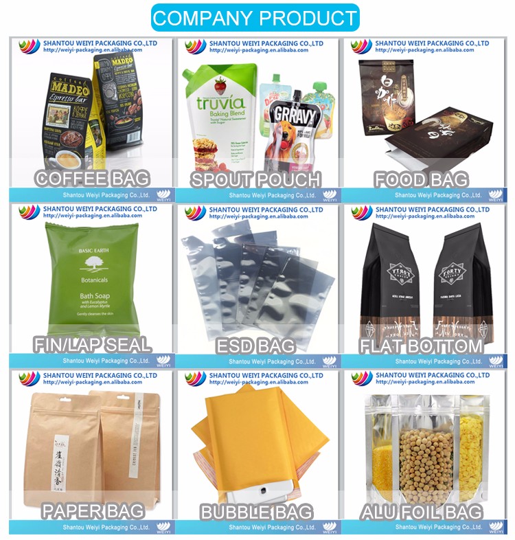 WEIYI упаковка Является профессиональным производителем гибких пластиковых упаковочных пакетов и упаковочной пленки для пищевых продуктов, морепродуктов, кофе, чая, напитков, закусок, корма для домашних животных и т. д.