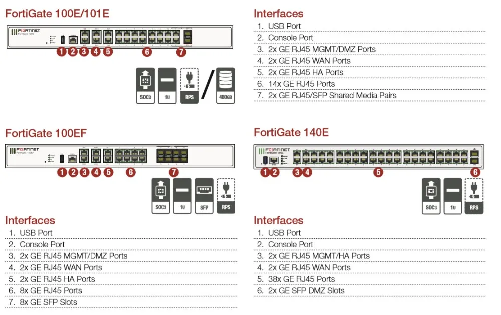 GE RJ45 Management/HA/DMZ Ports | 1/2/1 | 1/2/1 | 1/2/1 | 1/1/- | 1/1/- |