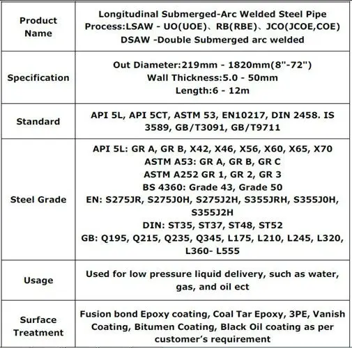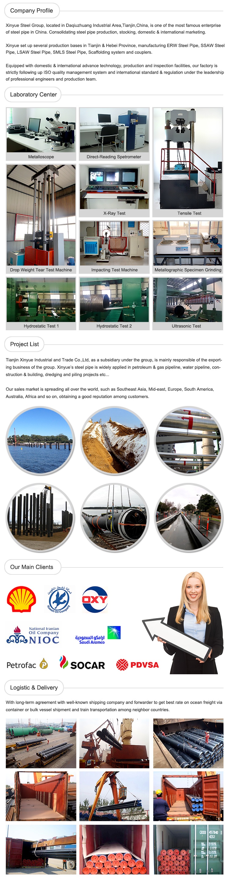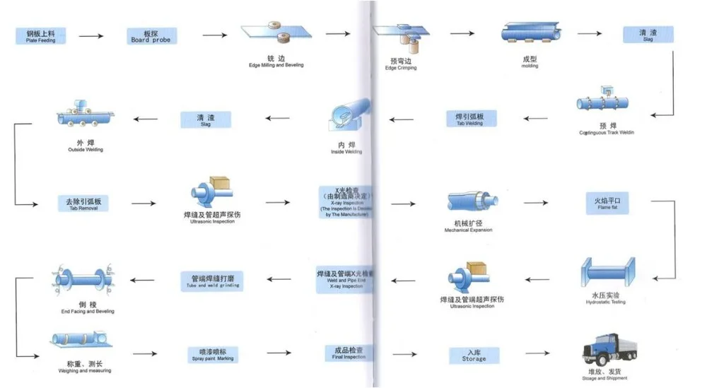 Мы специализируемся на производстве высокотехнологичных ERW (сварных электрических сопротивлений) и SSAW (спиральных дуговых сварных) труб. Наша компания имеет передовые & phi;610 мм высокочастотный прямой шов сопротивление сварочный аппарат, и & phi;3048 мм спиральная дуговая сварная машина. Кроме того, помимо заводов ERW и SSAW, у нас есть еще три сопутствующих фабрики для производства LSAW и SMLS по всему Китаю.