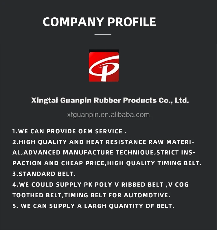 Xingtai Guanpin Rubber Products Co., Ltd. was established in 1994, We have more than 20 years manufacture experience in automobile and farm machinery, introduced domestic and foreign advanced production technology and professional talents, specialized in poly ribbed belt, V-belt, timing belt and other automobile rubber spare parts, all products passed ISO quality system certification, sales to domestic and foreign market, such as Europe, Southeast Asia, The middle east, Africa etc. All of our products obtained the trust of buyers. We adhering to the integrity, innovation, and win-win concept, welcome you to here to cooperate with us in the near future.