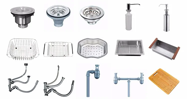 Вспомогательное оборудование: | Сетчатый фильтр, трубы, корзина, разделочная доска, дозатор для жидкого мыла, зажимы, шаблон для опционально |