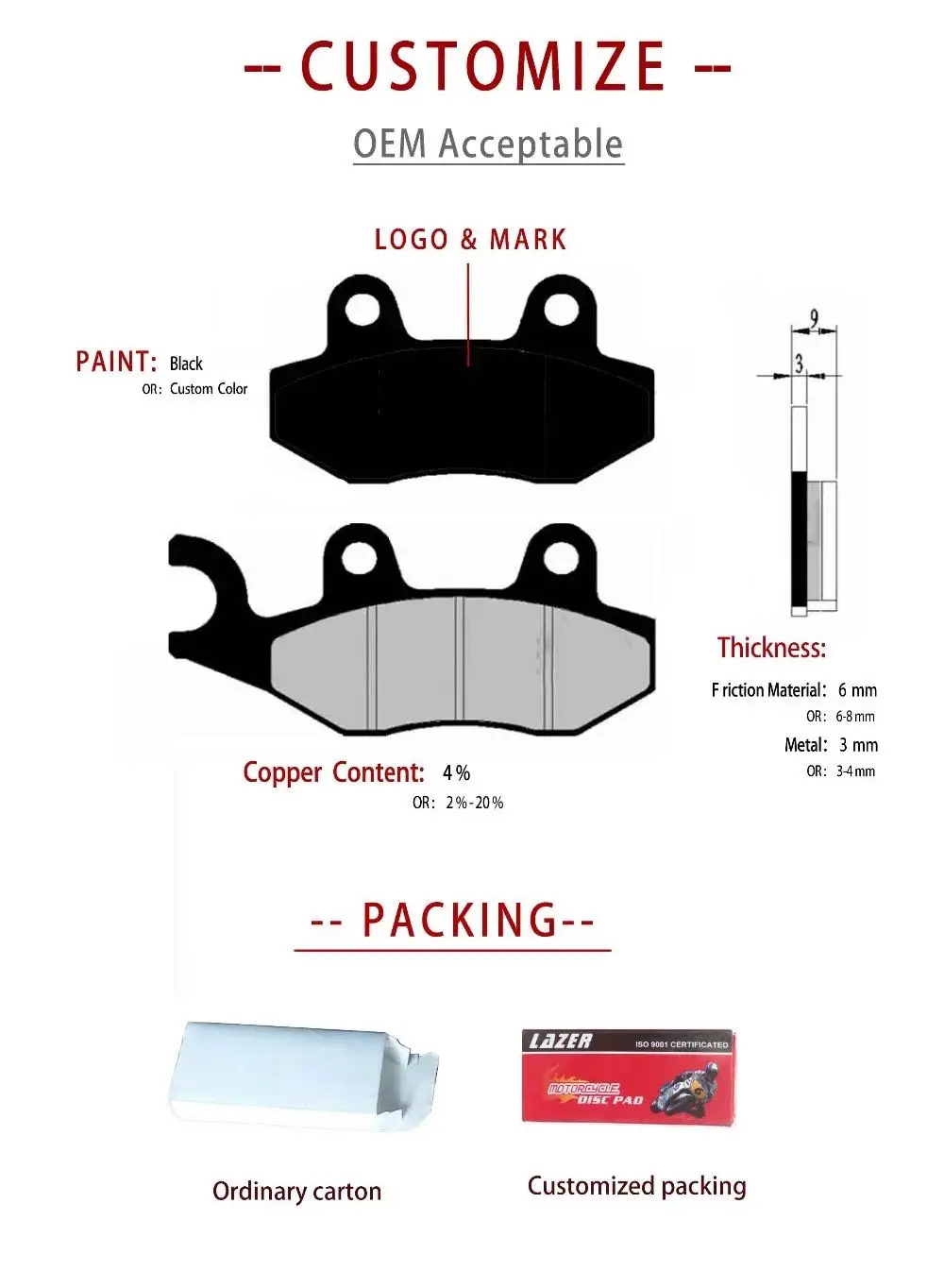 1.- OEM customer's packing(Customer brand packaging) of brake pad. 2.- Offer our neutral packing(Plain carton packing) of brake pad. 3.- Offer color box packing of brake pad. |
