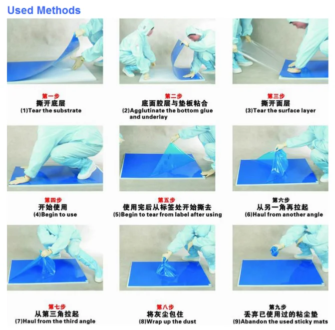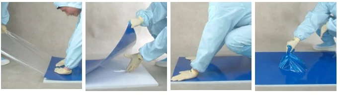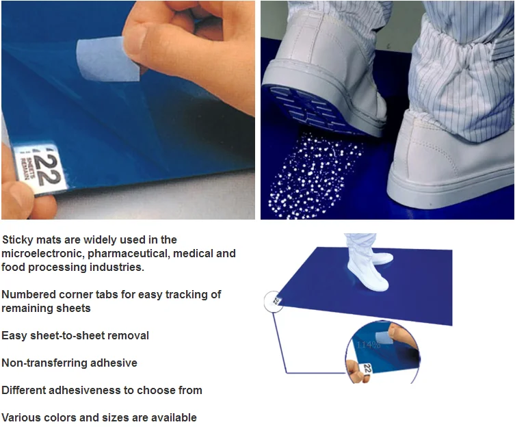 Cleanroom Sticky mat are comprised of 30 or 60 layers of adhesive-mat PE (polyethylene) film which effectively removes dirt, dust from shoes, wheels of equipment and other things. Sticky mat can capture these dirt and dusts from shoes, wheels when pass over it. When the exposed layer is completely used, just need to peel it off to expose another clean layer simply. We have four color available: blue, white, grey, green. The common size is 18"*36", 24"*36",26"*45". As for the thickness, it is from 0.035mm to 0.050mm. Package detail: 10pcs/box, 10boxes/carton. Sticky mat provide a unique, cost-effective solution to capture dirt before it is tracked into your workplace, cleanroom, office.
