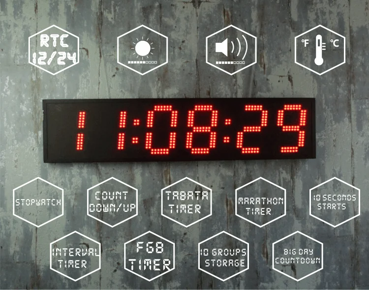 Один таймер можно использовать в большом зале, на открытом воздухе марафонском мероприятии, в больших днях обратного отсчета, гаражных часах и температурном дисплее.