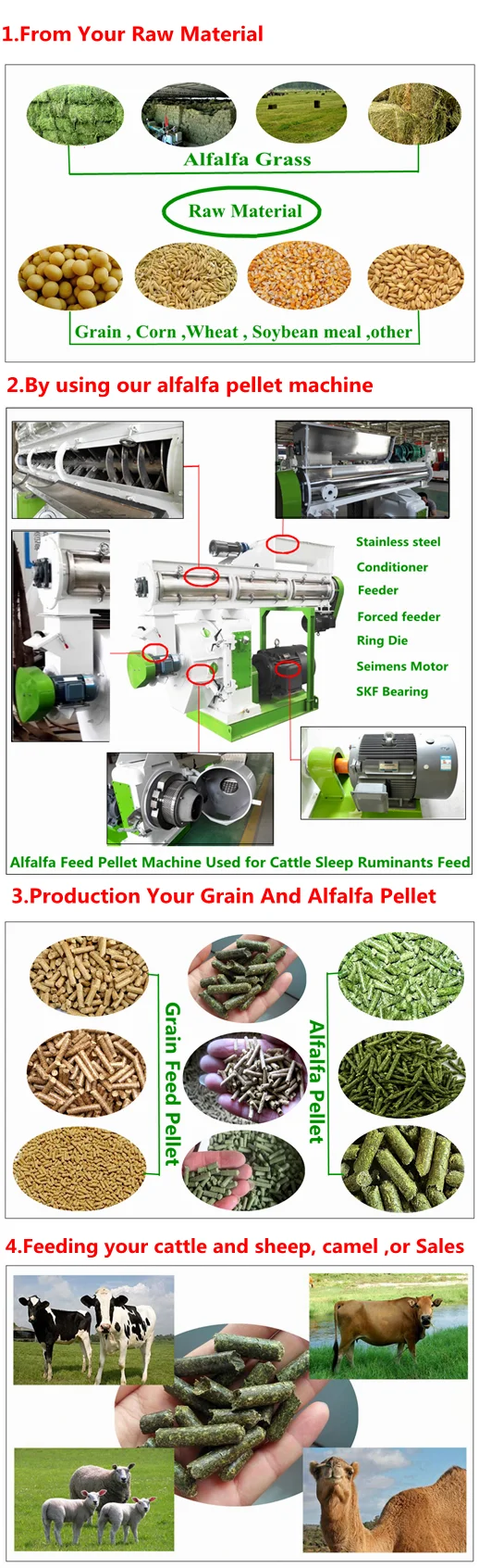 Этот гранулированная Люцерна, машина по изготовлению кормового брикета для могут быть использованы для того, чтобы сделать рогатого скотаКормовых гранул для всех возрастов крупного рогатого скота овец и других жвачных. И это хороший выбор для владельца фермы и тех, кто планирует шаг в птицы и жвачных корма промышленности. Кормовых гранул Может быть использован для того, чтобы ваши фермы в использовании, также может быть использован для маркетинга.