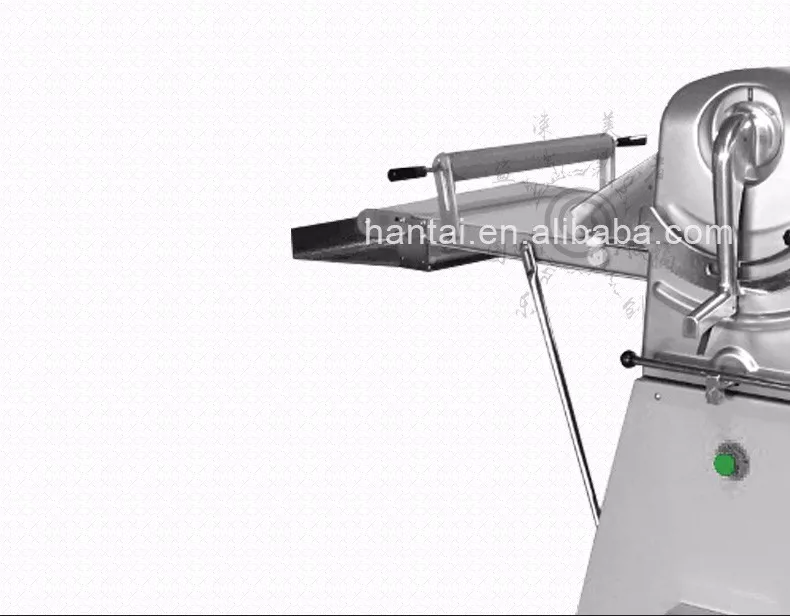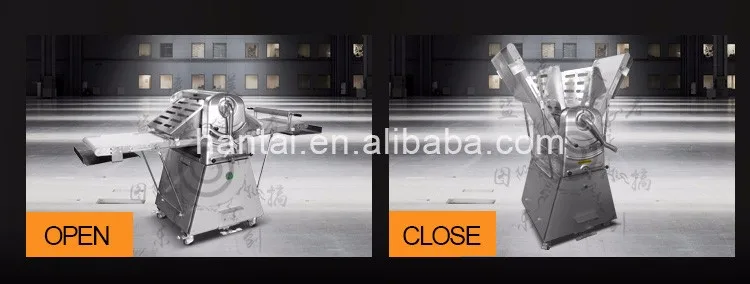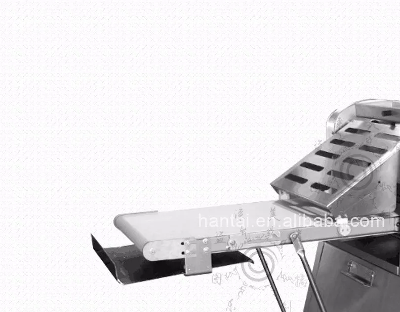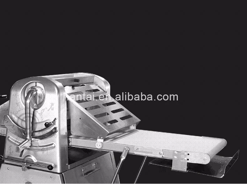 2.\tThis machine has a Conveyor Belt on each of the left and right side. The Conveyor Belt on one side feeds dough to a pair of rollers, where the dough is pressed thin, and then the pressed dough is sent out by the Conveyor Belt on the other side. The feeding side is slower while the sending-out side is faster. Automatic speed adjustment will be carried out when the role of the two sides is reversed.