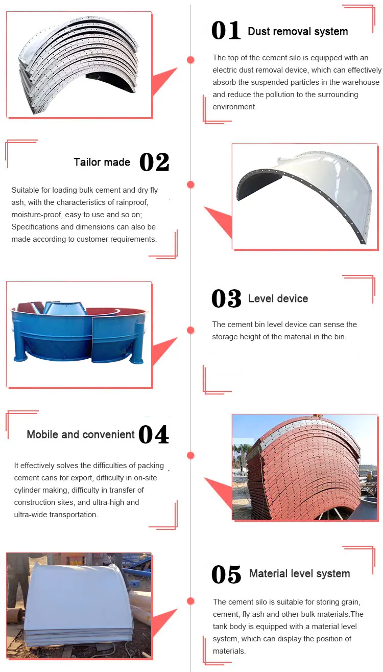 2. Цементный силос подходит для хранения всех видов сухих небольших гранул или порошковых материалов, таких как цемент, летучая зола, сухой песок, химический порошок, уплотненный порошок, добавка и т. д.Обычно применяется для смешивания станции, сухого минометного завода, шоссе, железной дороги, туннеля, моста, пристани и другой передачи сыпучего цемента.