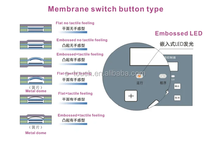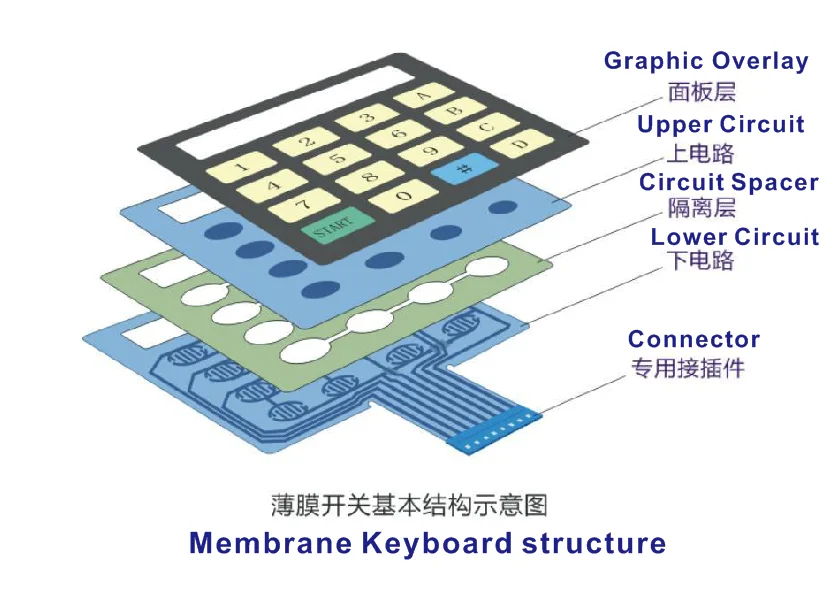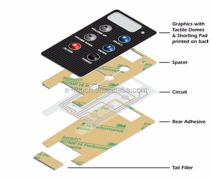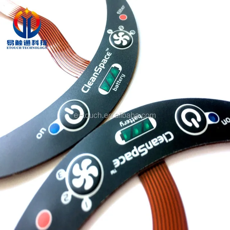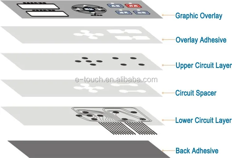A membrane switch is a momentary switching device that is manufactured by using a series of flexible layers of polymer films and adhensives. The upper-most layer, called a graphic overlay, is manufactured by printing on the second surface of clear polyester or polycarbonate film. Membrane switches can be constructed with multiple circuit layers, and more complicated graphic design features, such as domed key embossing. Designs that are more complex require, more material layers for proper construction and reliable operation. Membrane switches, when combined with components such as a tactile dome, graphic overlay, or integrated LEDs or resistors can provide the designer with virtually limitless capablities to create the ideal custom user interface for their products.
