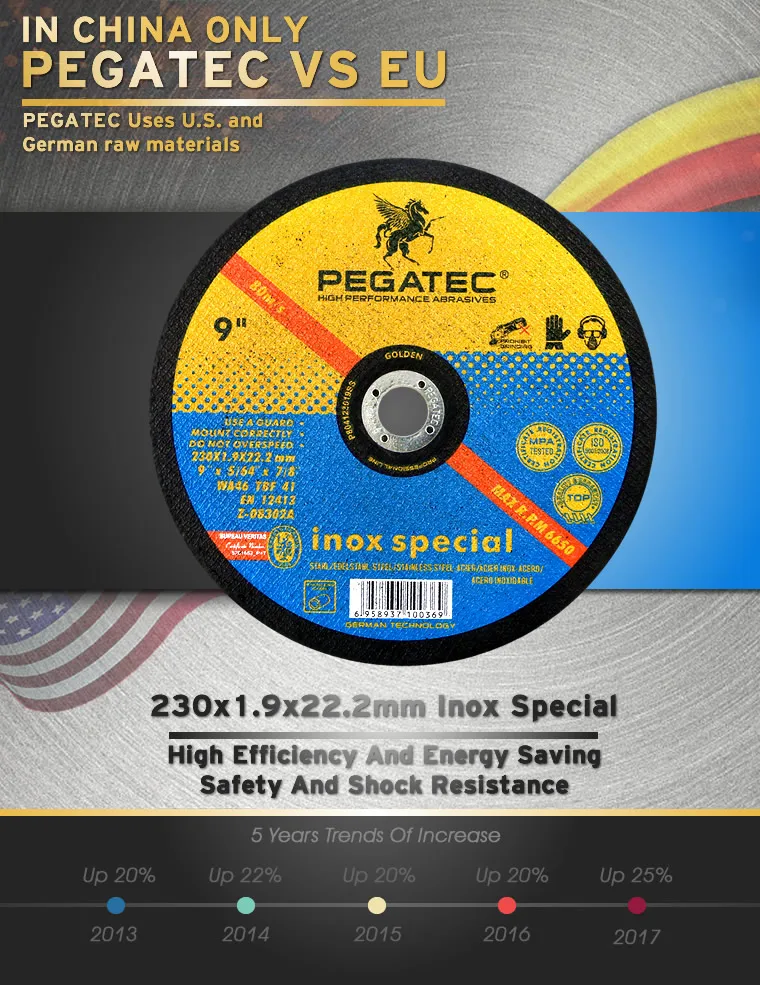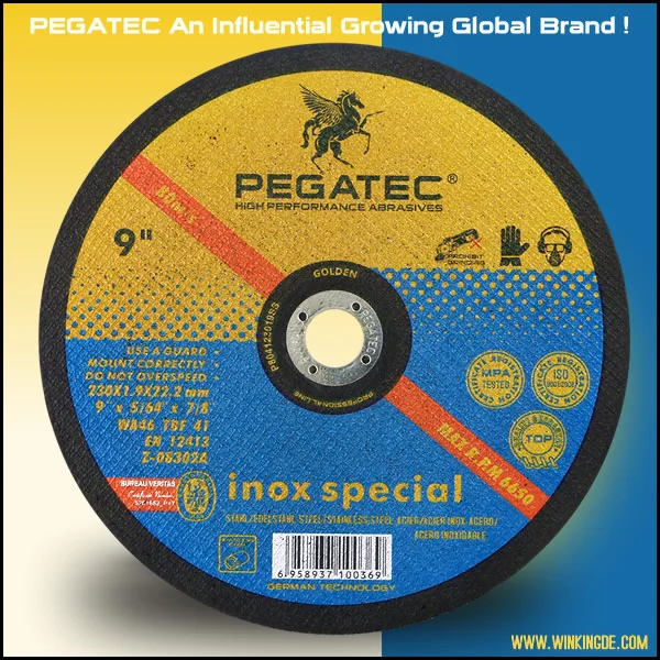 PEGATEC 9 "230x1,9x22,2 мм режущий диск из нержавеющей стали подходит для промышленных зон с сертификацией ISO & MPA Используется для 9 "угловая шлифовальная машина, 230 мм Диаметр изделия подходят дляЕвропа, Америка рынок и т. Д. INOX SPECIAL может быстро резать различные материалы, минимизировать трение, увеличить остроту и Предотвращает горячую коррозию из нержавеющей стали. Толщина 1,9 мм широко используется для различных видов резки. Увеличение боковой прочности для обеспечения Более безопасное применение. Улучшите боковую стабильность и гарантируем точность режущего диска. Имеют отличную абразивную производительность и дополнительную работуЖизнь в применении нержавеющей стали, Очевидное преимущество среди конкурентов различных брендов. |
