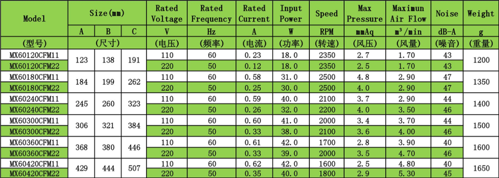 1.Material: Framework: Cast Iron Impeller: Aluminum alloy Protection: Impedance Protected Temperature Range: 0°C~+45°C(up to-50°C~+100°C) | 2.Major Characteristic Parameters: Bearing type: Ball bearing and Sleeve bearing Rated Voltage: 110V 120V 220V 230V 240V 380V Speed: 1600-2500RPM Air Flow: 60- 185CFM Niose Level: 40 - 46dB-A |