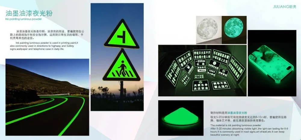 8. В дополнение, некоторые клиенты, которые печатают вывеску, являются модулированными чернилами для печати немедленно, они могут выбрать светящийся порошок компании Juliang ниже: JPB-384, JPG-384, JPG-394.